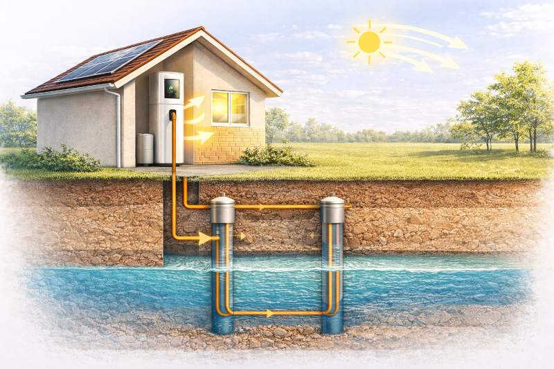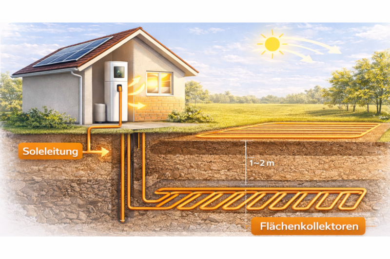 - Nutzt eine Erdsonde oder Flächenkollektoren im Erdreich